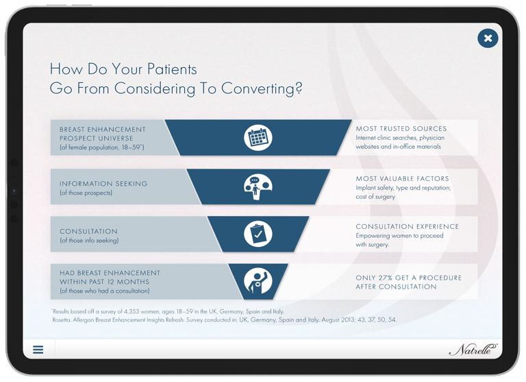 The brief was to create an iPad app to increase the up take of breast implants, presently there is a large discrepancy between Women who attend initial consultations and those who actually have the procedure.
