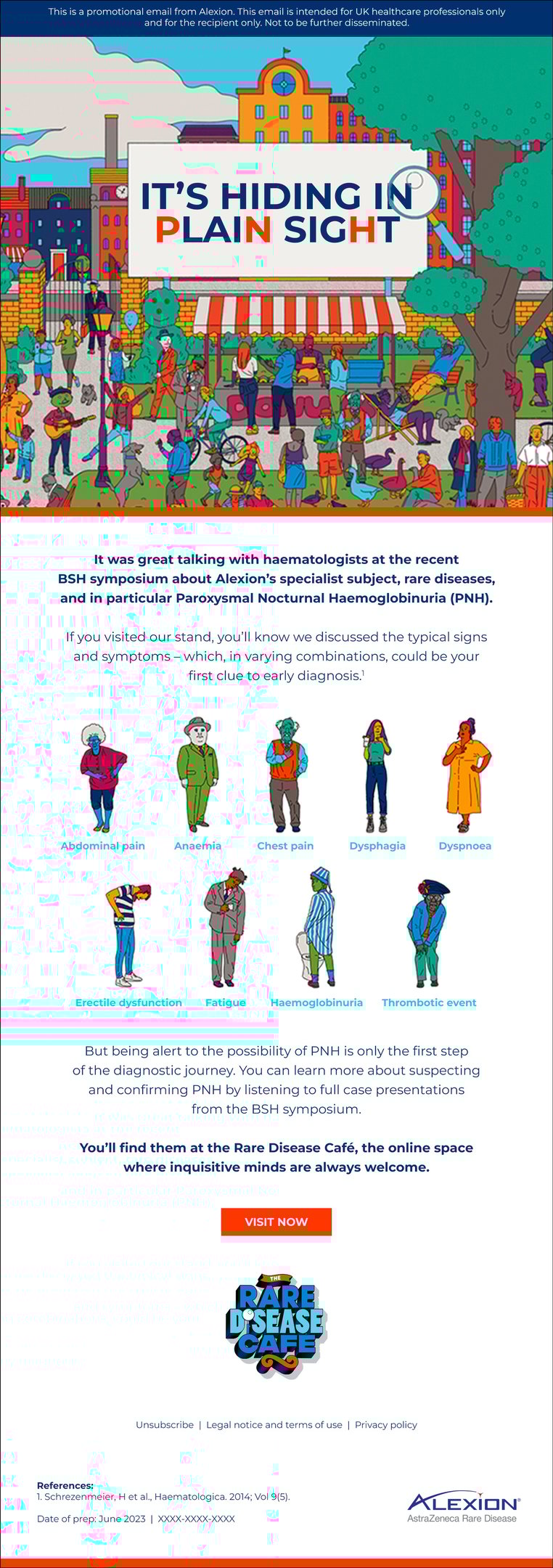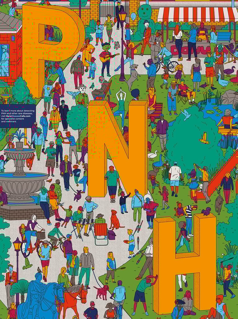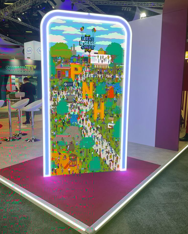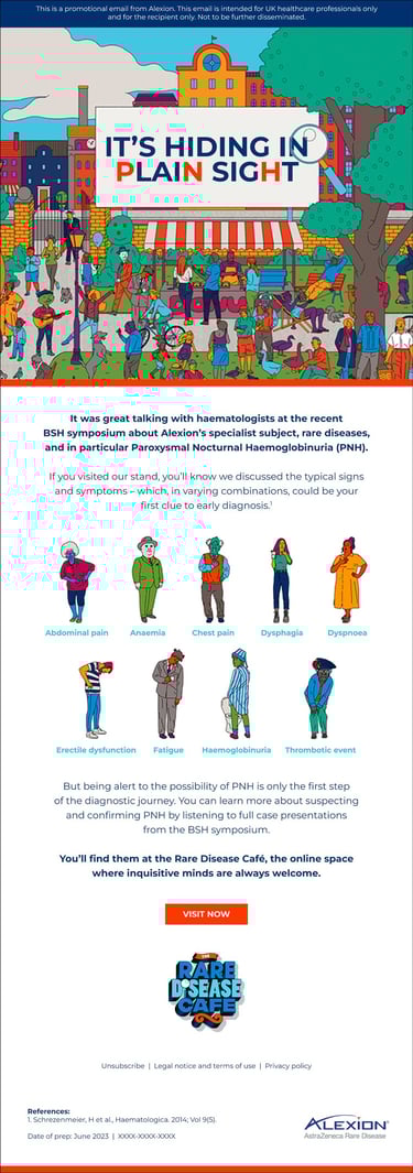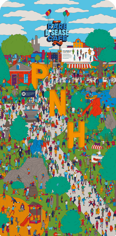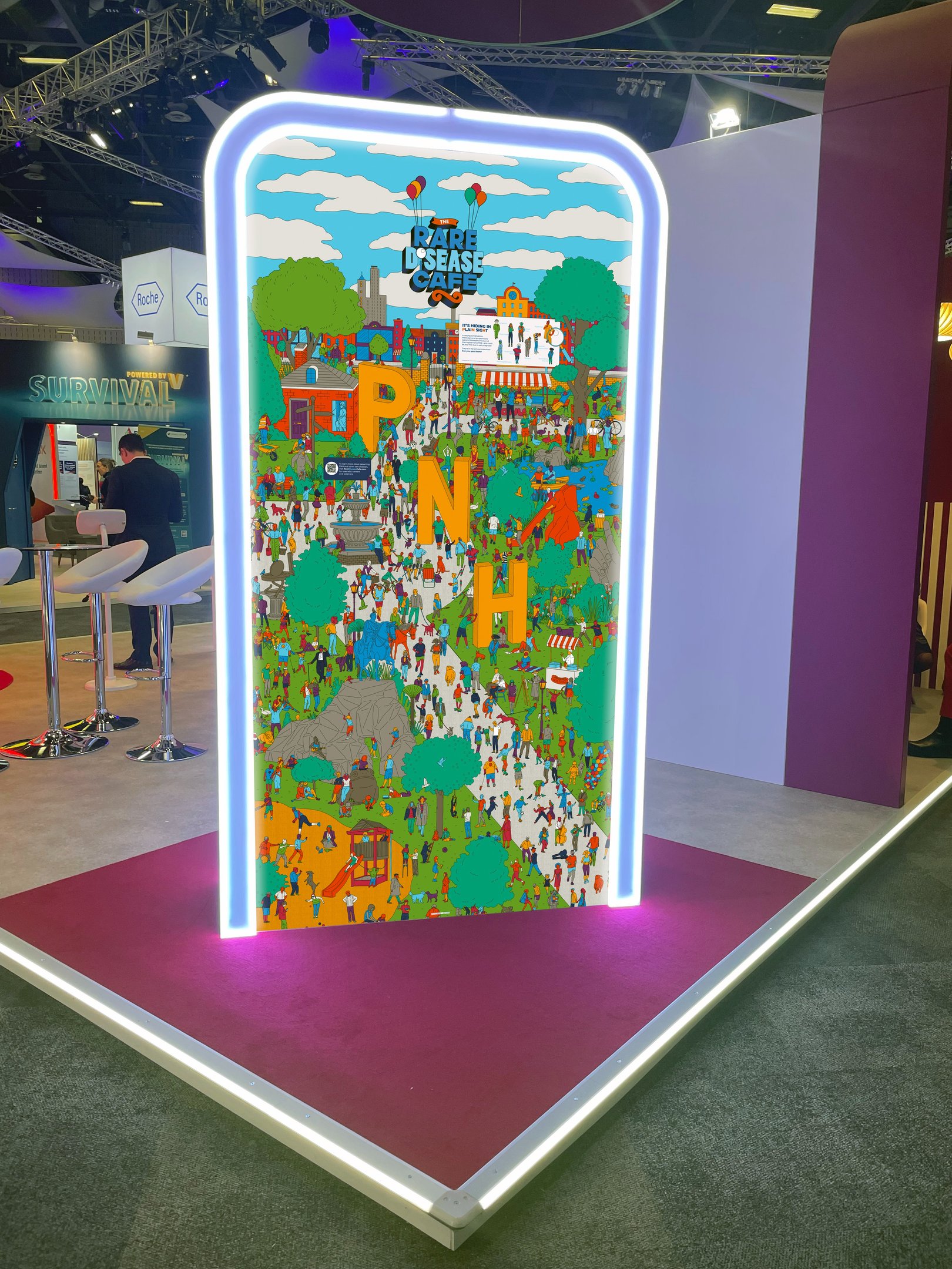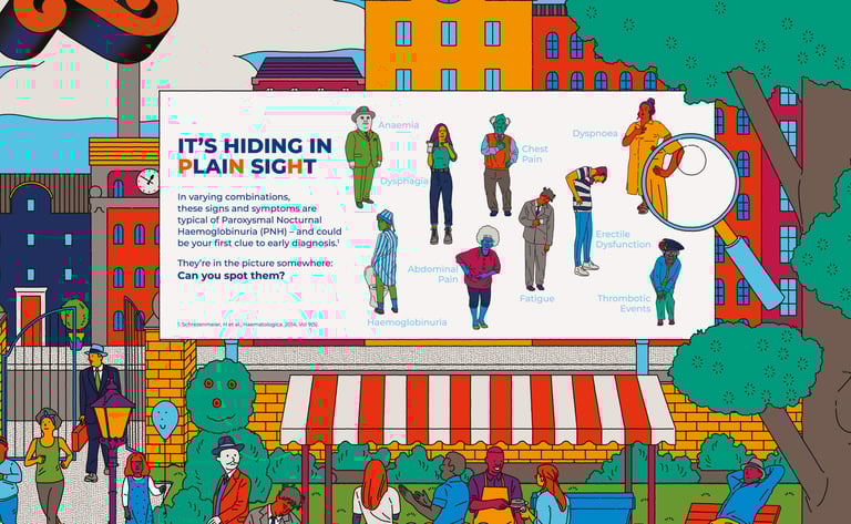 We created ‘The Syms’ – a family of nine unique characters, each one representing a PNH symptom. Then we asked the same illustrator to place our ‘Syms’ into a huge scene, alongside hundreds of people (like a Where’s Wally for haematology). This giant puzzle formed the centrepiece of our stand – under the banner of ‘IT’S HIDING IN PLAIN SIGHT’. Delegates at BSH were introduced to the nine ‘Syms’ and invited to try and find them among the crowd. We supported the puzzle content with a short animation introducing the nine characters and making the case for early diagnosis in PNH.
