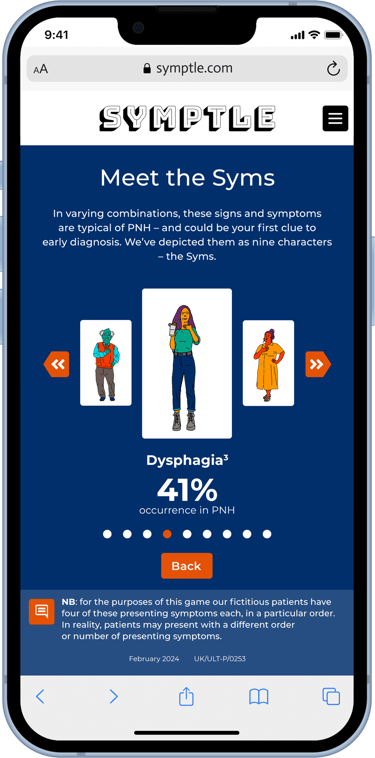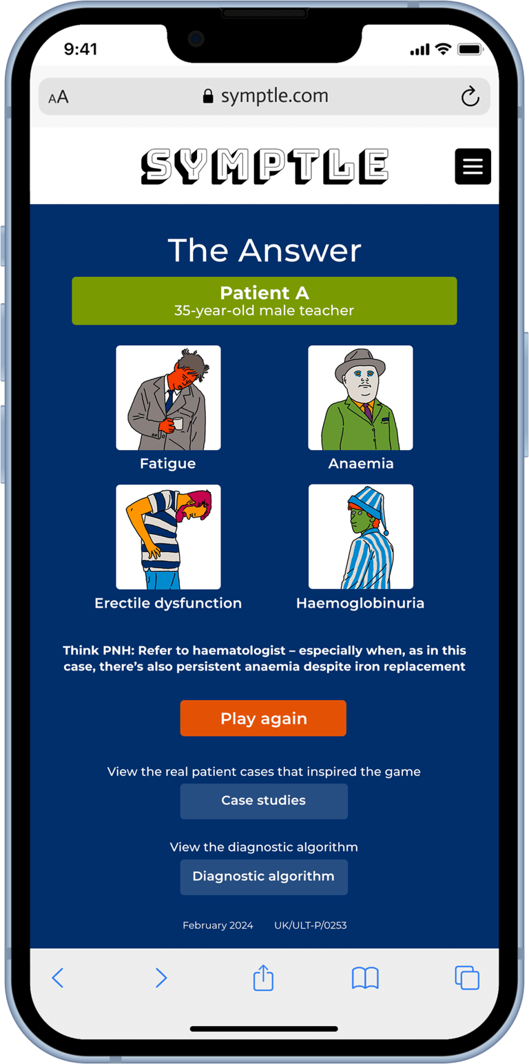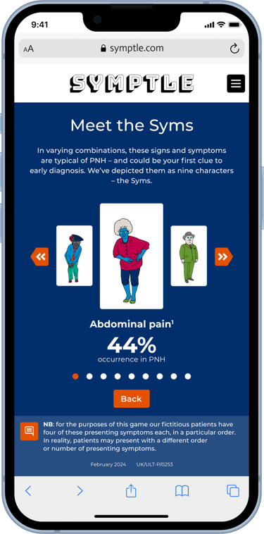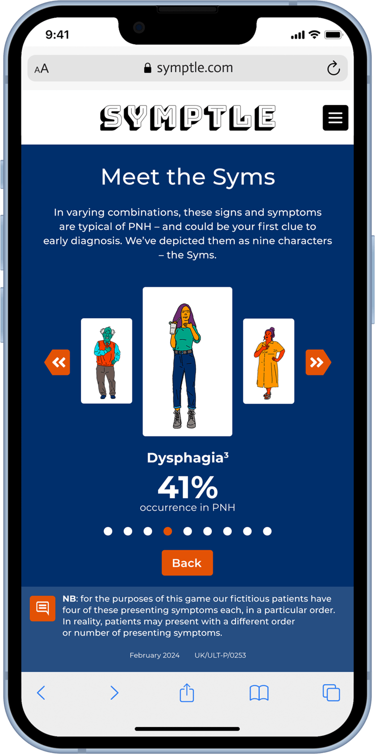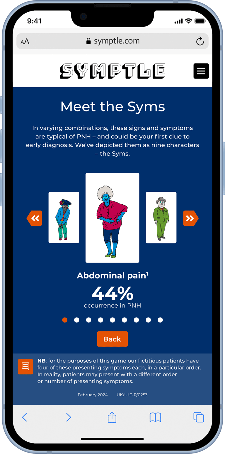 PNH is a rare disease. It’s life-threatening and no two patients present in quite the same way. Early diagnosis is vital, but highly challenging. There are nine signs and symptoms to know about; they can appear in varying combinations, and patients will generally present with only two or three. Diagnosis depends on physicians knowing the symptoms and making the connection with PNH – and then referring the patient to a specialist treatment centre.